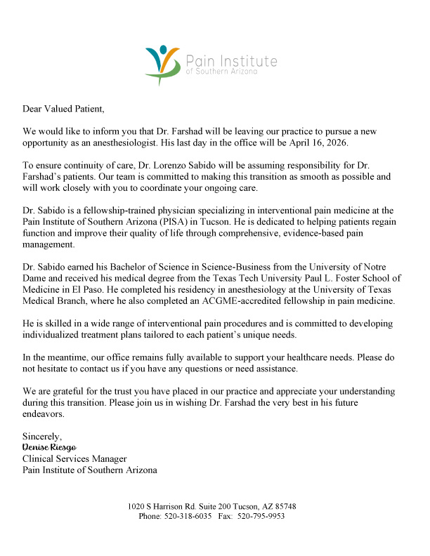 The Pain Institute of Southern Arizona (PISA) has specialized in Interventional Pain Management in Southern Arizona for over 20 years. The Regional Pain Institute (RPI) joined the PISA practice and has helped expand quality patient care to Queen Creek/San Tan Valley and Apache Junction, Arizona.