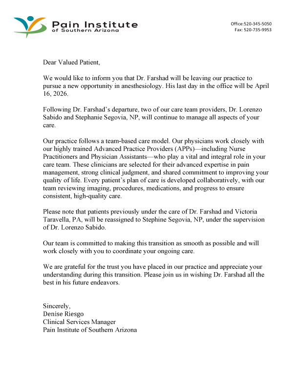We would like to inform you that Dr. Farshad will be leaving our practice to pursue a new opportunity in anesthesiology. His last day in the office will be April 16, 2026.